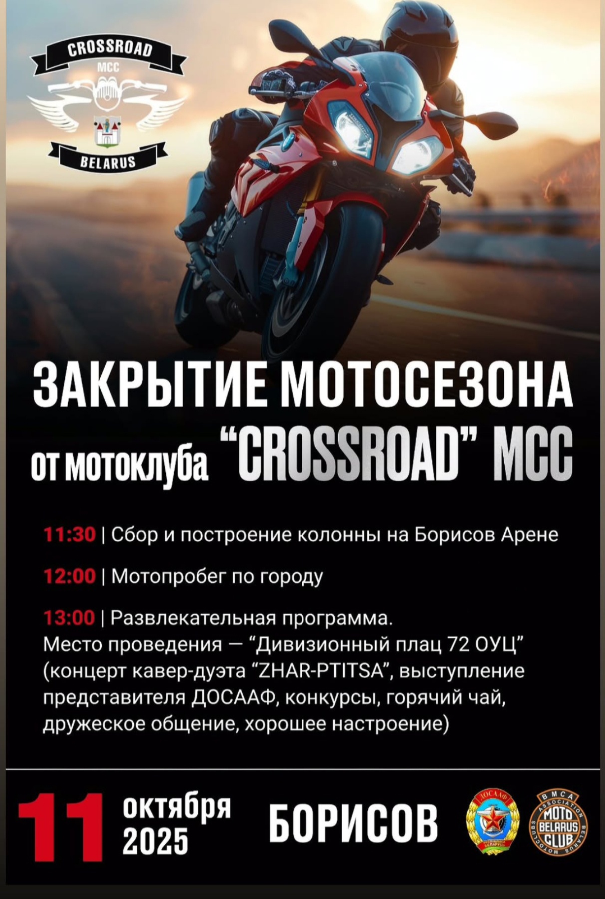 11 октября 2025 года в г. Борисове мотоклубом «CROSSROAD» MCC совместно с Борисовской ООС ДОСААФ были проведены мероприятия по закрытию мотосезона 2025. В мероприятиях приняло участие около 500 любителей езды на механическом «коне».