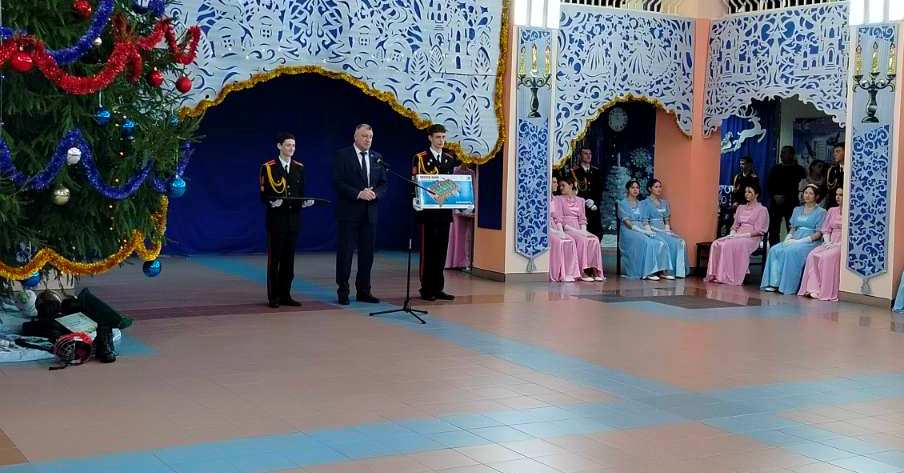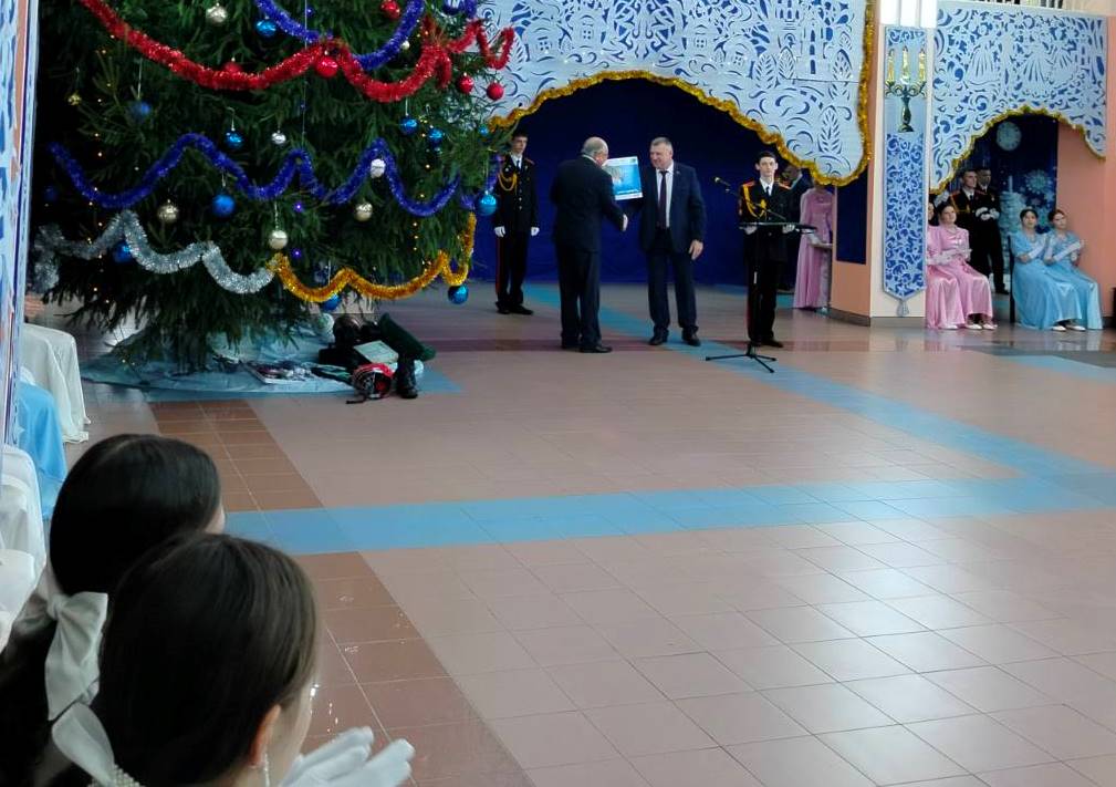 Председатель Слуцкого оборонного Общества Владимир Ильич Овсянников пожелал всем присутствующим здоровья, благополучия, счастливого нового года, вручил руководству училища спортивный инвентарь и игры для организации досуга кадетов.
